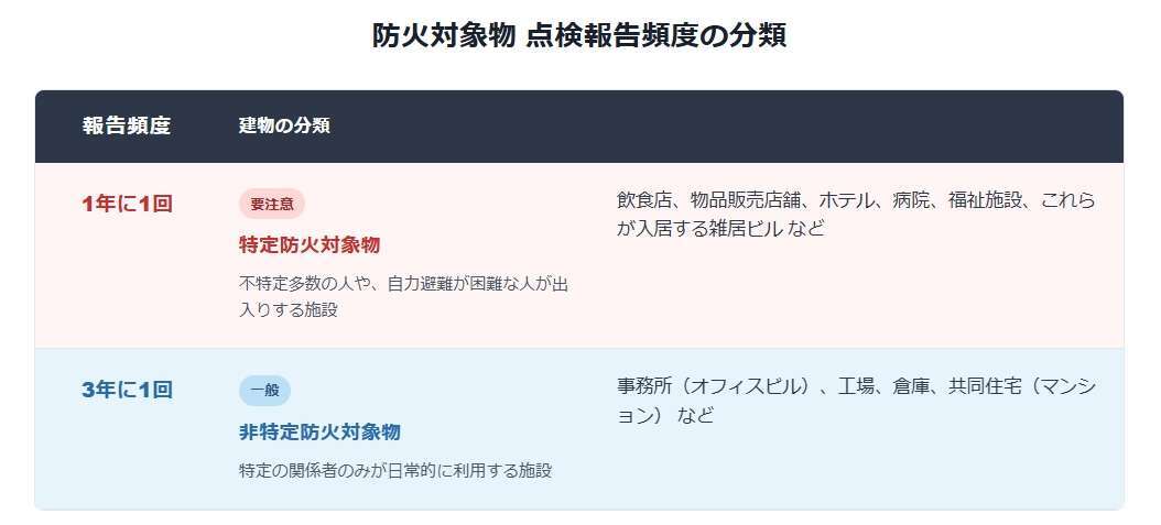 -報告頻度はビルの用途で決まる:「特定防火対象物(1年に1回)」と「非特定(3年に1回)」