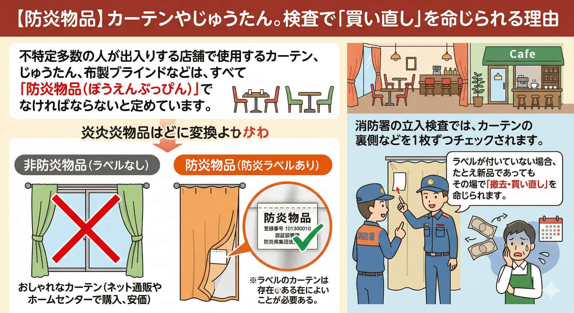 消防署の立入検査では、カーテンの裏側などに「防炎ラベル」が付いているかを1枚ずつチェックされます。ネット通販や一般のホームセンターで安く購入したおしゃれなカーテンにこのラベルが付いていない場合、たとえ新品であってもその場で「撤去・買い直し」を命じられます。