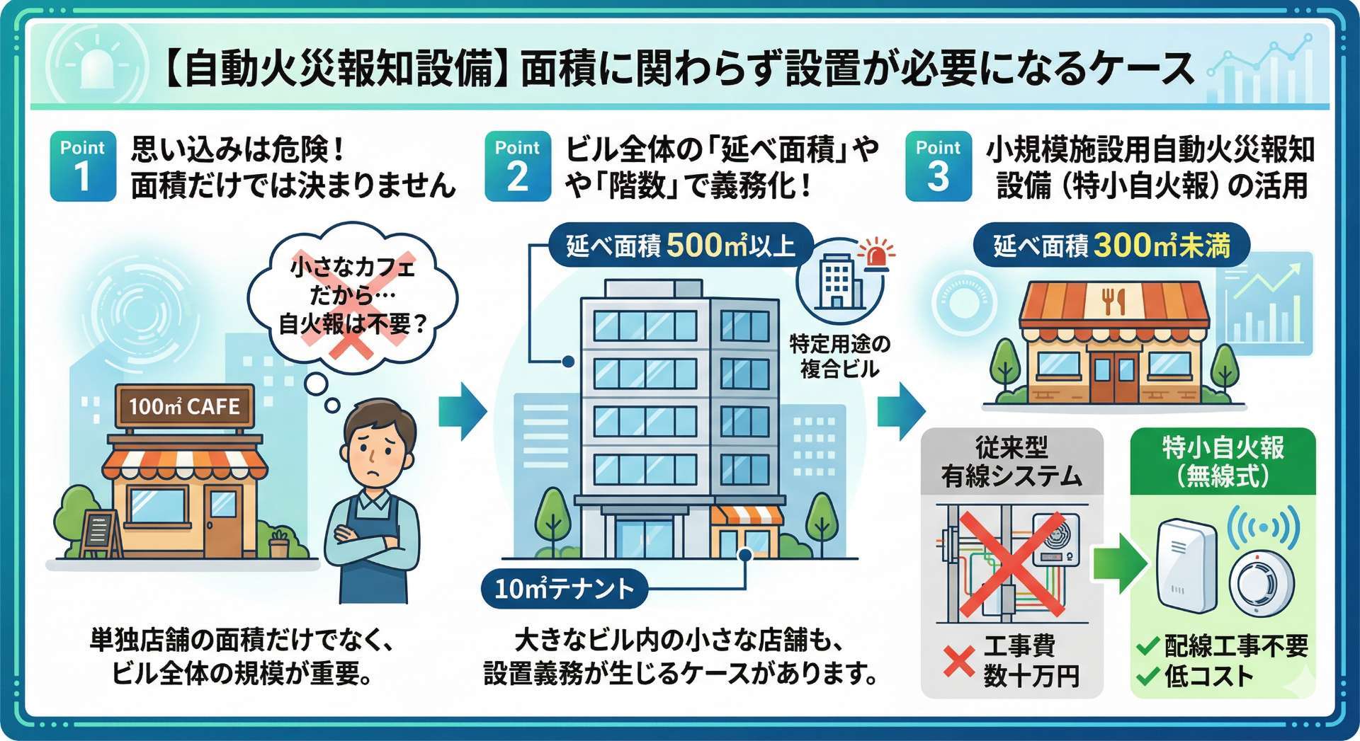 ビル全体の延べ面積が500㎡以上(特定用途が入る複合ビルの場合)であれば、その中に入居する10㎡の小さなテナントであっても、自火報の設置義務が生じるケースがあります。