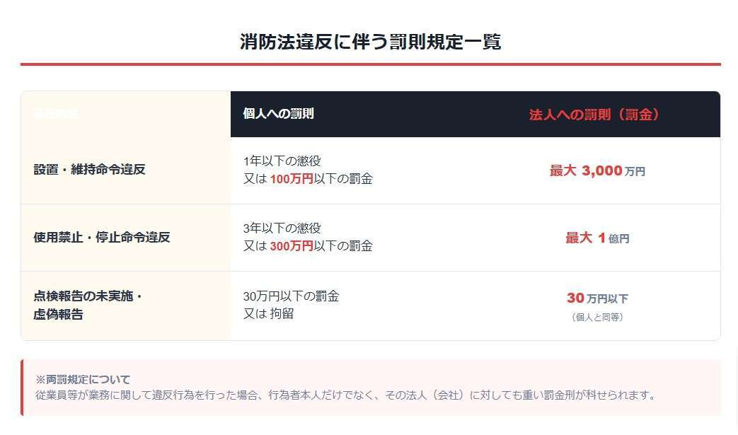 消防法の罰則は、実行した個人(店長や従業員)だけでなく、その企業(法人)も同時に罰する「両罰規定」が採用されています。特に、悪質な違反や命令無視に対しては、法人の規模に関わらず巨額の罰金が科されます。